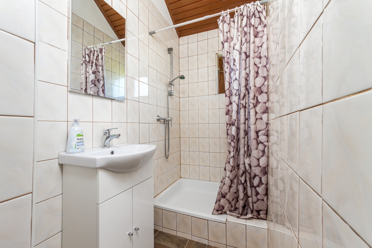 Földszint: Nappali étkezővel, konyha, fürdőszoba, zuhanyzó, WC, fedett terasz. Csigalépcső!