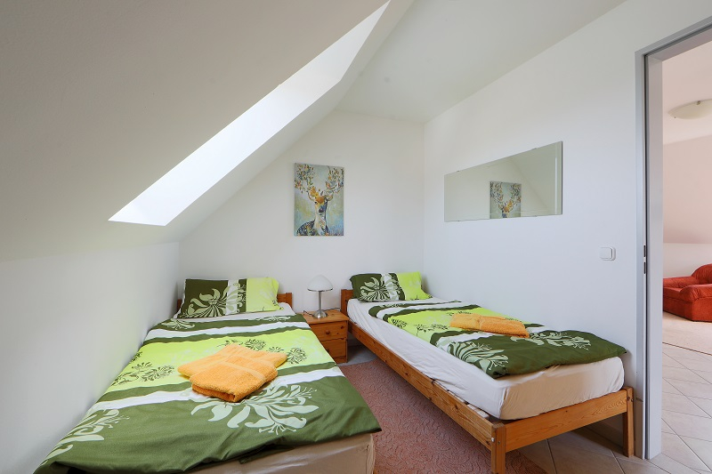 2. Emelet: Nappali főző-, étkezősarokkal és egy fekhellyel, egy kétágyas szoba, zuhanyzó/WC, balkon.